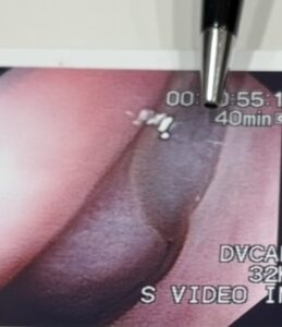 ペンで指している透明の部分です。周りの粘膜も浮腫んで腫れています。